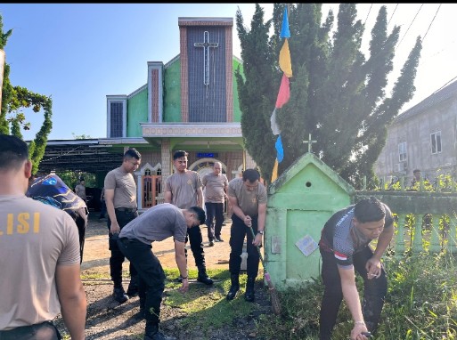 Dalam kegiatan tersebut, personel kepolisian bersama masyarakat melakukan kerja bakti membersihkan halaman gereja dan lingkungan sekitar. Selain menjaga kebersihan, kegiatan ini juga menjadi sarana untuk membangun komunikasi yang harmonis serta meningkatkan rasa kebersamaan di tengah masyarakat.