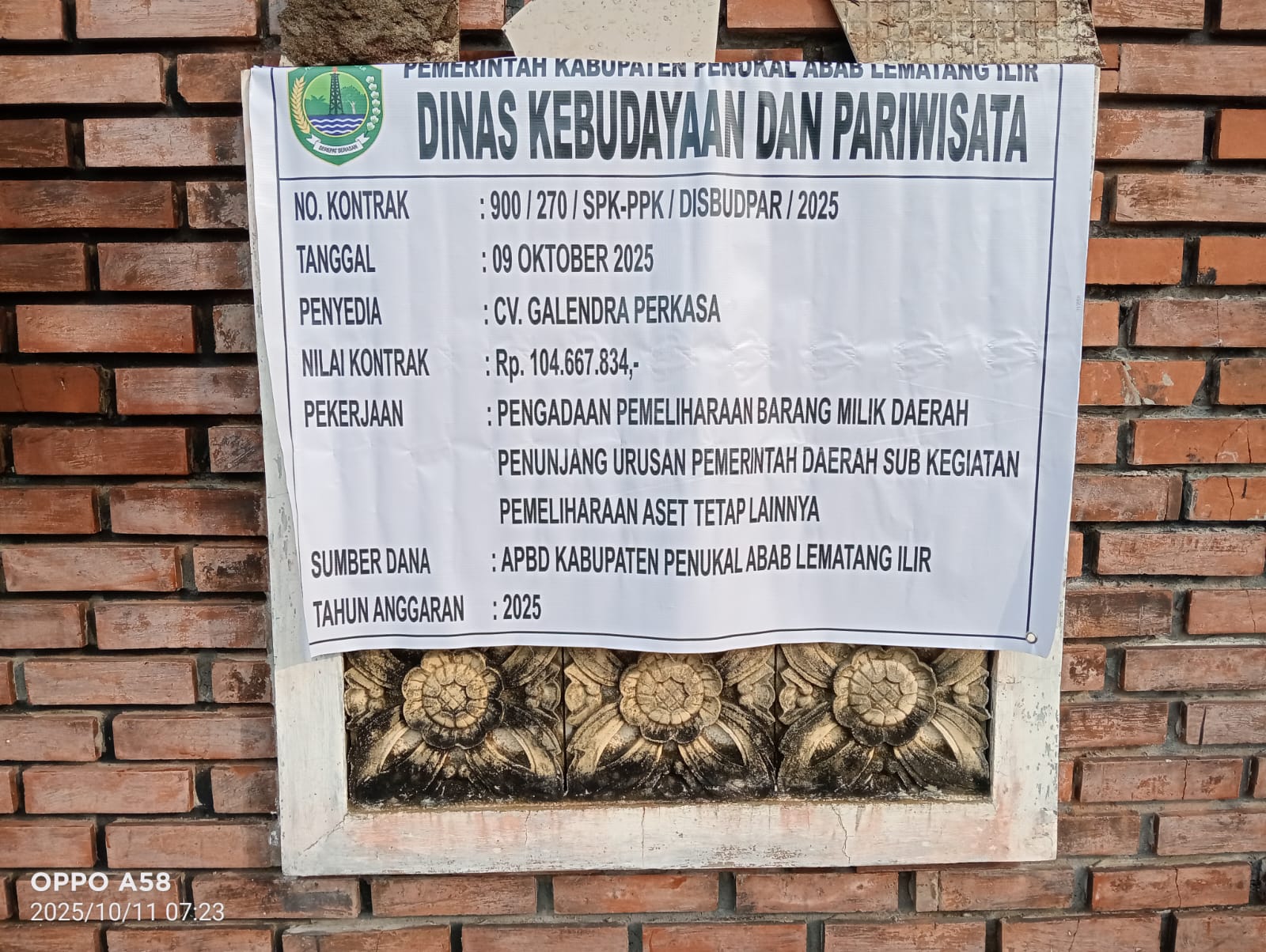 Berdasarkan pantauan di lapangan, papan proyek yang kini terpasang menunjukkan bahwa kegiatan tersebut berada di bawah Dinas Kebudayaan dan Pariwisata Kabupaten PALI dengan nilai kontrak sebesar Rp104.667.834,00. Proyek ini dikerjakan oleh CV Galendra Perkasa, dengan sumber dana dari APBD Kabupaten PALI Tahun Anggaran 2025.